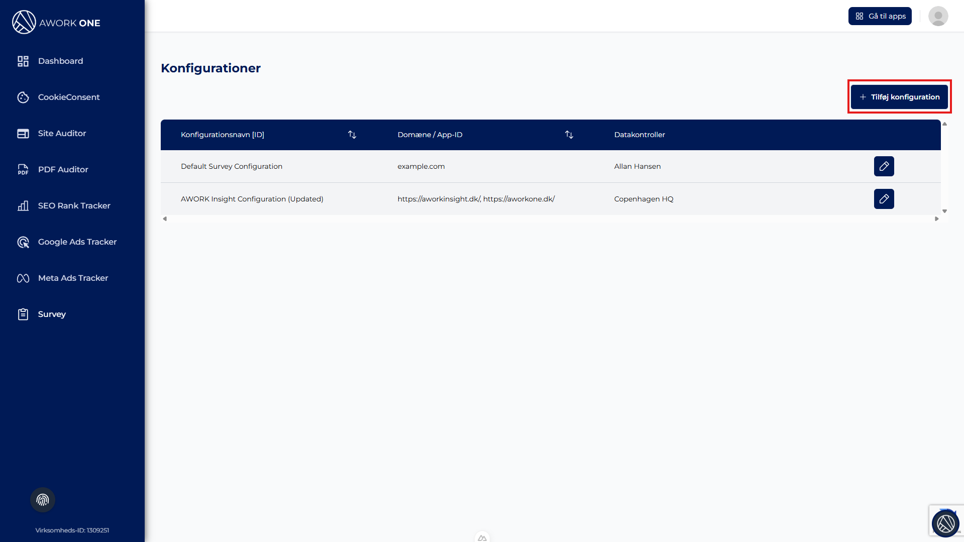 Trin 1: Vælg en virksomhed Fra samtykkelisten skal du klikke på pilen (→) ud for virksomhedsnavnet for at åbne konfigurationerne. Trin 2: Klik på Tilføj konfiguration Klik på Tilføj konfiguration øverst til højre. Trin 3: Indtast ...