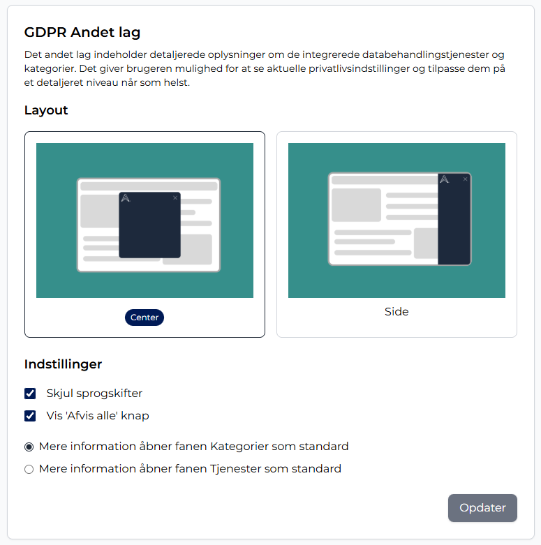 Det andet lag indeholder detaljerede oplysninger om tjenester, kategorier og databehandling.
